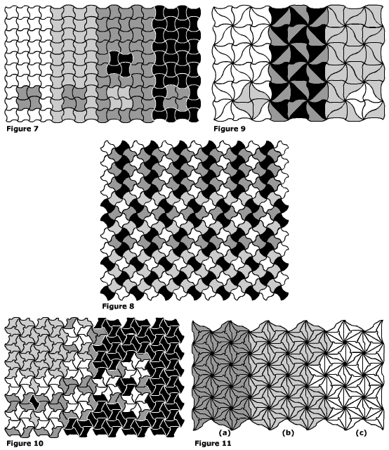 Figures 7 and 8 demonstrate how the traditional spiral tilings with an underlying square grid with S-curves alone (Figure 3a), C-curves alone (Figure 3b) and the rare tiling with S-curves and C-curves (Figure 3c) come to life and can work together when the fourth tile is added to complete the combinatoric set. The two tiles with both S-curves and C-curves act as a bridge to the other two tiles which cannot be laid next to each other. This set is natural and aesthetically very pleasing for applications as mosaics in different mediums. Other sets such as the one shown in Figure 10 are not as aesthetically pleasing and may be more of interest as challenging puzzles than used for applied art.